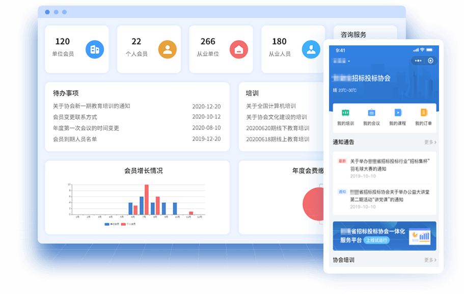 安訊協(xié)會一體化服務平臺,是按照“互聯(lián)網+社會組織”的理念,采用 “云計算、大數據”等先進信息技術,立足協(xié)會服務會員、規(guī)范市場秩序、開展行業(yè)自律等需求,建立的一體化管理與服務平臺,集成會員、從業(yè)人員、從業(yè)單位管理,通知、培訓、會議、咨詢、資源、直播服務,以及門戶網站、移動應用,實現協(xié)會各業(yè)務數字化整合,全面提升各方獲得感,為協(xié)會服務國家、社會、行業(yè)提供全面的信息化支撐。